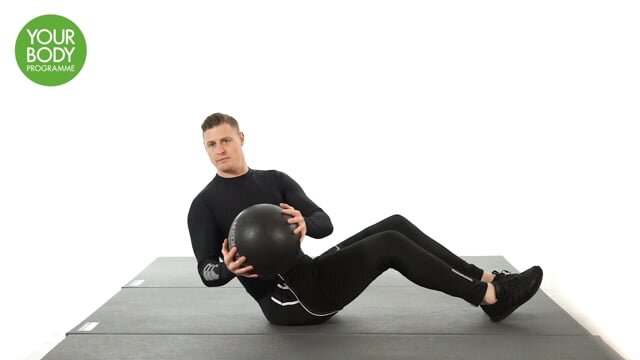 Sit upright with your knees bent and feet on the floor. Hold a medicine ball in both hands with the arms slightly bent and lean backwards engaging the core. Rotate the torso taking the ball side to side, keep the chest lifted and navel drawn to spine.