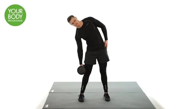 Stand feet shoulder width apart and hold a dumbbell in one hand. Laterally flex the body, lowering the dumbbell towards the floor, then pull over to the opposite side keeping your core engaged and shoulders retracted.