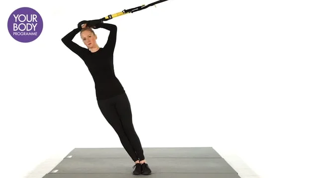 Turn the TRX into a single handle (info on technique page). Stand side on, hold the TRX above your head with your body straight but at a slight angle to the floor. Allow the hips to lower away from the TRX into lateral flexion, then draw the body back to a straight line.
