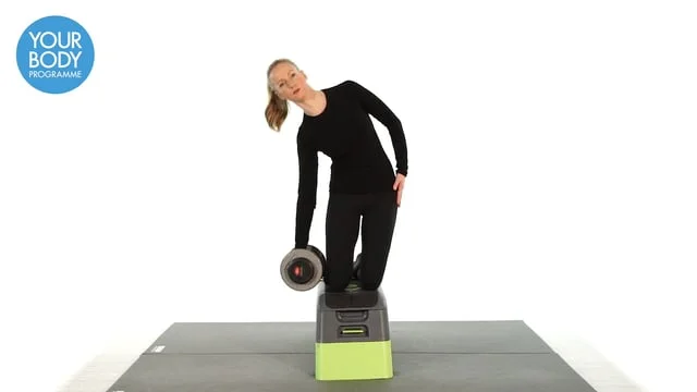 Kneel on a box/bench with your glutes contracted and hold a dumbbell in one hand. Laterally flex the body, lowering the dumbbell towards the floor, then pull over to the opposite side keeping your core engaged and shoulders retracted.