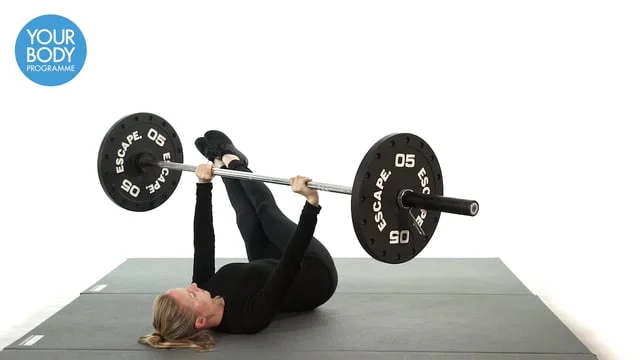 Lie on your back, hold a barbell above you and raise both legs. Keeping the legs straight, lower them to one side under control. Try to keep the bar level and draw your navel to spine as you bring the legs back to centre. Alternate sides.