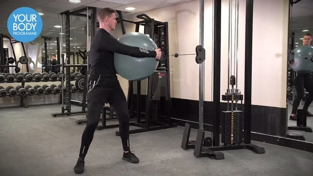 Stand side on to a chest height cable. Wrap your arms around a swiss ball and hold it to your chest. Hold the handle with the hand furthest away so the cable wraps around the centre of the ball. Engage your core and rotate the torso away from the machine in a smooth motion. Return under control.