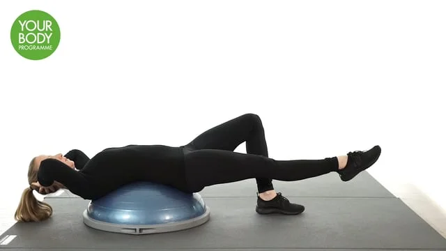 Lie with your back over a bosu (dome side up), hands to your head and 1 leg extended. Curl up into a crunch, keeping a slight gap under the chin and simultaneously raise the knee towards the nose. Lower the body as you extend the leg.