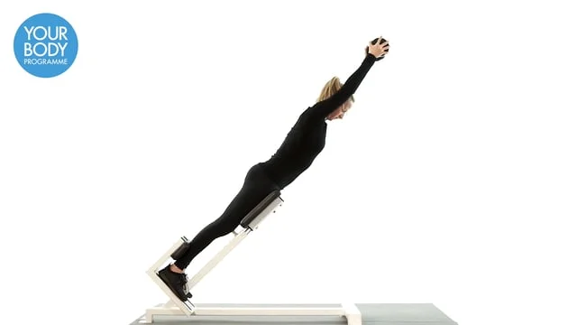 Lie forward with your pelvis over a swiss ball with your feet locked against a wall for support. Hold a dumbbell with both hands, extend the arms and engage the core. Contract the glutes and raise the back in line with the body taking the dumbbell overhead to continue the line of the movement.