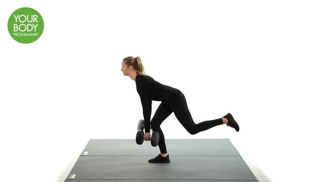 Stand on 1 leg and hold a dumbbell in each hand. Bent the supporting knee, hinge forward from the hip and lower the dumbbells towards the floor. Allow the free leg to move backwards. Go to the point where you can maintain neutral spine, do not round the back. Straighten the leg.