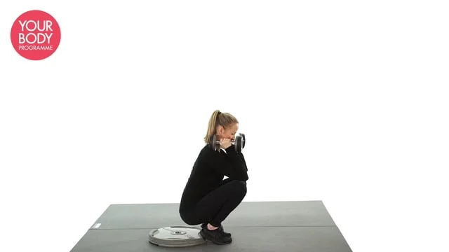 Stand with your feet close together and heels raised onto a plate. Hold dumbbells to your shoulders and lower into a squat. Take the squat as deep as possible keeping your chest lifted. Allow the knees to come slightly forward of the toes.