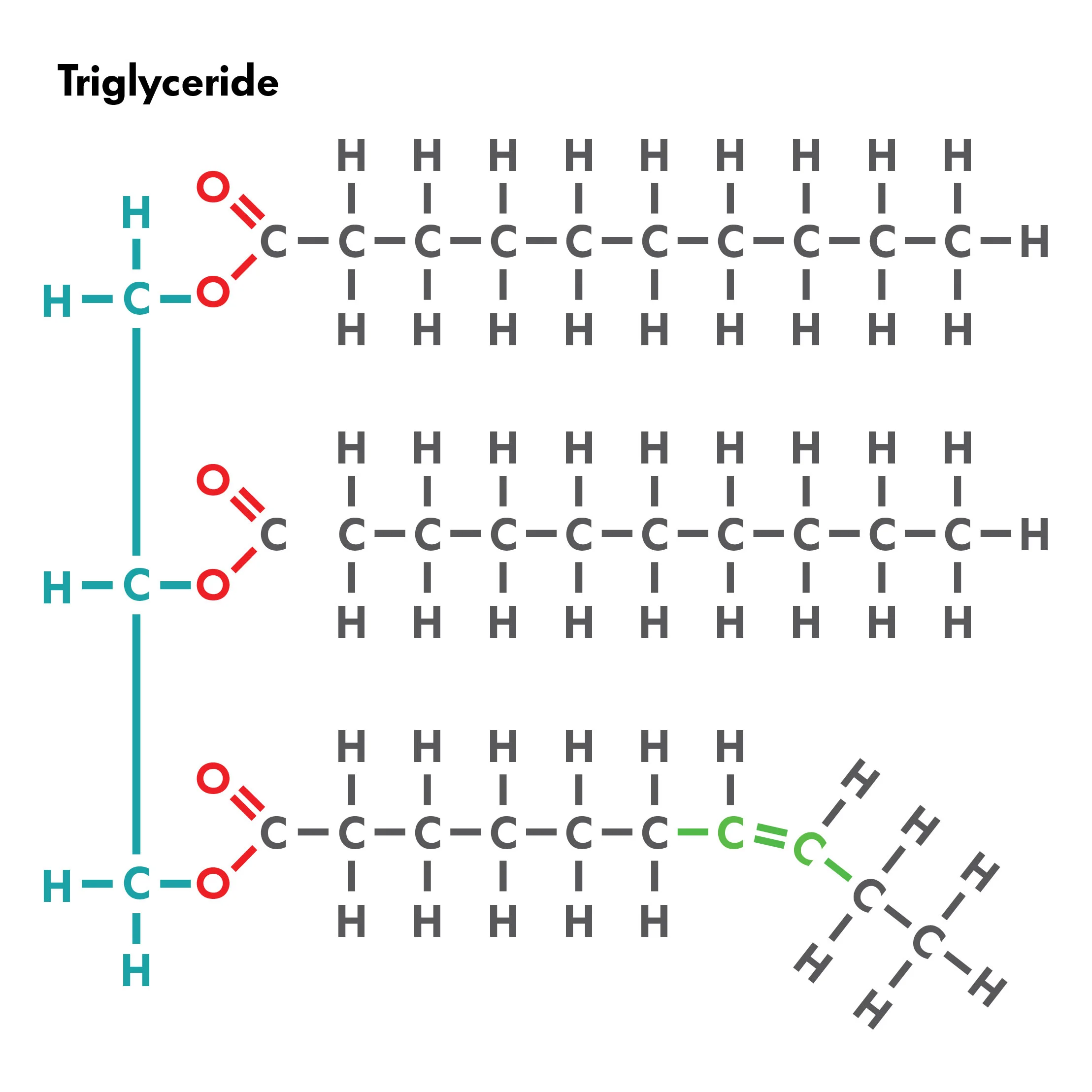 The picture below shows a triglyceride. The bluish-green column down the left-hand side is the glycerol backbone, the red portion attached to the glycerol is the carboxyl group. The black chains are the fatty acids. The first two are saturated fatty acids and the third one is an omega 3 fatty acid, as there is a green double bond, 3 carbons from the end of the chain.