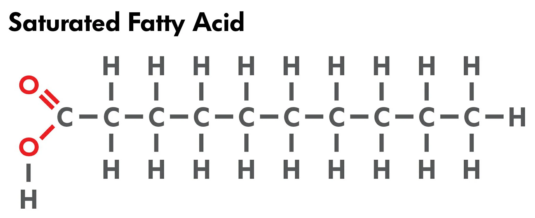 Saturated fatty acids have no double bonds between the carbon atoms of the fatty acid chain and are thus fully saturated with hydrogen atoms. There are many different kinds of naturally occurring saturated fatty acids, which differ by the number of carbon atoms, ranging from 3 carbons (propionic acid) to 36 (hexatriacontanoic acid).