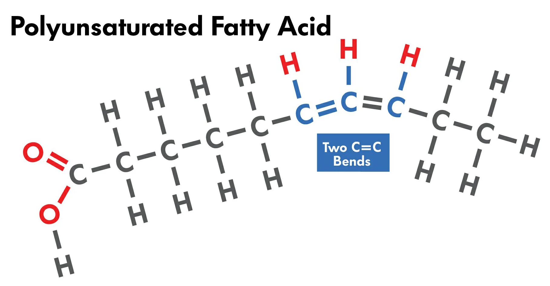 Polyunsaturated fats can be broken down into two categories, omega-3 and omega-6. Omega-3 fatty acids have a double bond 3 carbon atoms away from the methyl carbon (end terminal of the carbon chain, a cluster of carbon and hydrogen atoms). Whereas omega-6 fatty acids have a double bond 6 carbons away from the methyl carbon.
