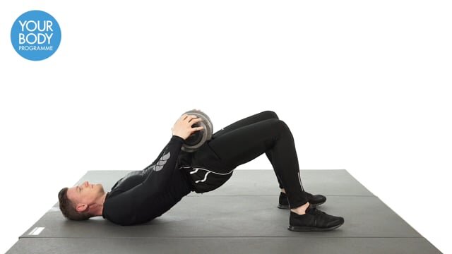 Lie on your back with your knees bent, feet flat on the floor hip width apart and a dumbbell held on your hips. Push through your heels and lift your hips as high as possible (do not roll through the spine). Ensure to contract the glutes. Lower under control. 10 reps x 2 sets