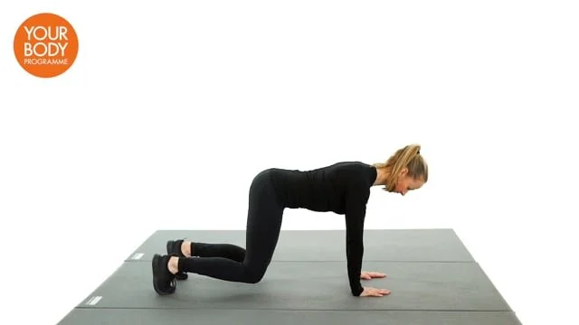 Begin in a box position with your weight even on all 4 points. Press your palms into the floor, draw your shoulder blades down your back, engage your pelvic floor, draw your navel to spine and raise the knees an inch off the floor. Hold the position. 10 seconds (working up to 20. x2