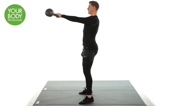 Stand feet slightly wider than shoulder width and hold a kettlebell in both hands. Squat and swing the bell through the legs maintaining neutral spine, do not round the lower back. Allow the momentum to lift the bell up to shoulder height, do not lift with the arms. Keep the core engaged.