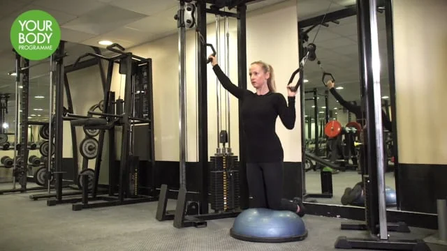 Kneel on the bosu (dome side up) with your feet raised and hold high cables in both hands. Engage your core with the arms extended. Maintain neutral spine and alternately pull with one arm drawing the elbow into your side. Keep the chest lifted.
