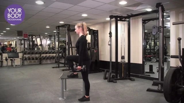 Stand side-on to a high box or bench box with 1 foot placed on top and dumbbells held at your side. Step up by pushing through the heel of the foot and maintaining neutral spine. Lower under control. Do not use the underneath foot to aid the movement.