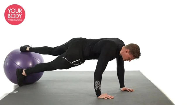 Begin in a hand plank position with your feet on a swiss ball, draw your navel to spine and create a straight line through the body. Make sure your hands are underneath your shoulders and rotate your lower body, rolling the ball from side to side.