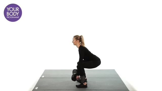 Stand feet shoulder width apart and hold dumbbells to your shoulders. Bend the knees into a deep squat, push the bottom backwards and maintain neutral spine. Press the heels into the floor as you extend the legs. Make sure your knees track inline with your toes.