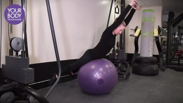Lie forward with your pelvis over a swiss ball with your feet locked against a wall for support. Hold a dumbbell with both hands, extend the arms and engage the core. Contract the glutes and raise the back in line with the body taking the dumbbell overhead to continue the line of the movement.