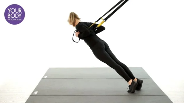 Start in a press-up position with the TRX attached behind you. Take your weight onto your toes and walk your feet further underneath you to make the exercise more challenging. Maintain core stability and bend the arms lowering yourself into the press-up, keeping the hand position still, then extend the arms.