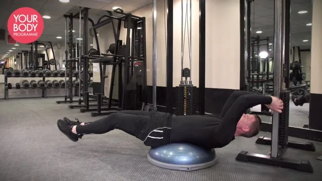 Lie with your back over a bosu (dome side up). Raise your legs and hold onto a stable surface behind you. Engage your core, maintain neutral spine and lower the legs towards the floor on the inhale. Do not allow the lower back to over arch and keep the legs as straight as possible. Exhale as you raise the legs.
