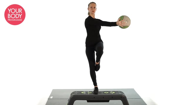 Stand with 1 foot placed on top of a box or bench and hold a medicine to your chest. Step up and extend the arms in front of you at chest height. Rotate the torso taking the ball across the raised leg, return to centre and lower. Continue with the same leg.