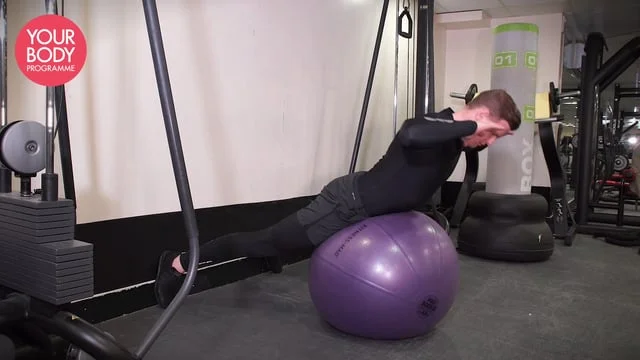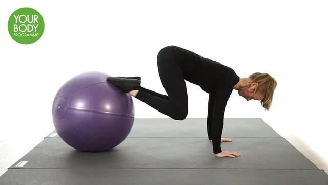 Begin in a hand plank position with your feet balanced on a swiss ball. Engage your core, draw your knees to chest and roll the ball inwards. Extend the legs as the ball rolls outwards until the body is in a straight line. To make the exercise easier place the ball on the ankles or shins.