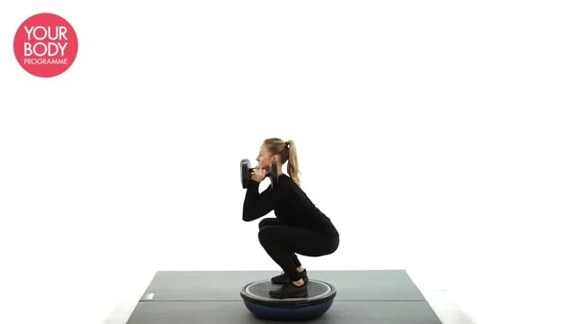 Stand on a bosu (flat side up) and hold dumbbells to your shoulders. Bend the knees into a deep squat, push the bottom backwards and maintain your balance. Make sure your knees track inline with your toes.