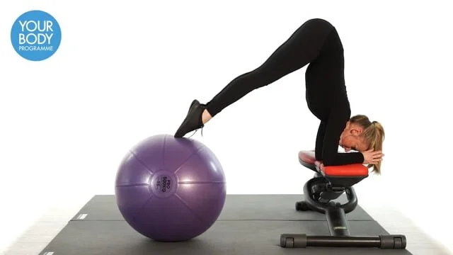 Begin in a plank position with your elbows on a bench and feet raised on a swiss ball. Engage your core, maintain neutral spine and raise your hips upwards as high as possible. Keep the legs straight and slowly lower back to the plank position.