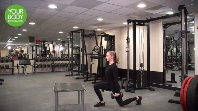 Hold the kettlebell in 1 hand and swing it backwards, simultaneously take the same leg back into a lunge. As the bell swings forwards to shoulder height step together, change hands and repeat the movement to the other side. Be aware of knocking the knees with the kettlebell.
