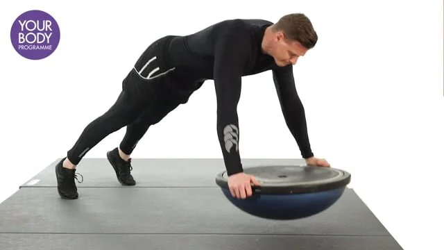 Begin in a press-up position, hands on a bosu (flat side up) and arms extended. Perform a press-up and push away forcefully using the momentum to lift the bosu off the floor in between repetitions. Maintain core stability.