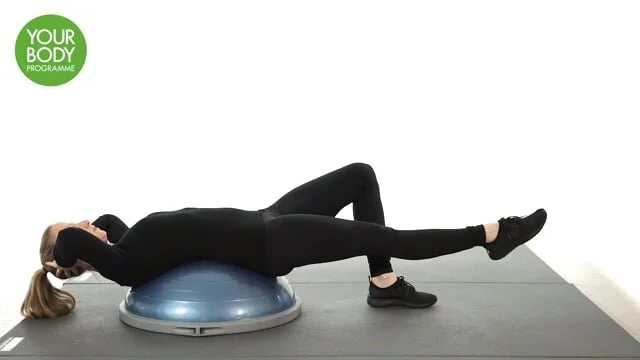 Lie with your back over a bosu (dome side up), hands to your head and 1 leg extended. Curl up into a crunch, keeping a slight gap under the chin and simultaneously raise the knee towards the nose. Lower the body as you extend the leg.