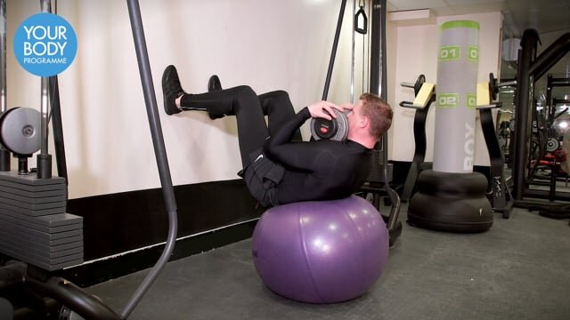 Lie with your back extended over a swiss ball. Place your feet onto a wall with the knees bend and hold a dumbbell to your chest. Curl up into a crunch, keeping a slight gap under the chin and simultaneously tilt the pelvis under. Lower under control.