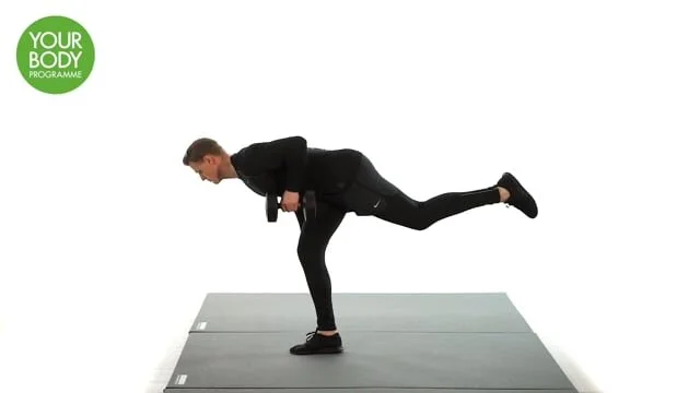 Stand on 1 leg and hold a dumbbell in the opposite hand. Bent the supporting knee, hinge forward from the hip and lower the dumbbell towards the floor. Allow the free leg to move backwards. Only go to the point where you can maintain neutral spine, do not round the lower back. Straighten the leg as you stand upright.