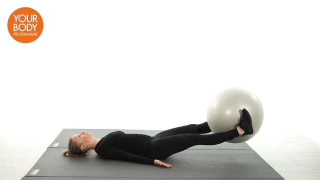 Lie on your back with your legs raised to the ceiling and a swiss ball held between the feet. Engage your core, maintain neutral spine and lower the ball towards the floor. Do not allow the lower back to over arch and keep the legs as straight as possible. Raise the legs.
