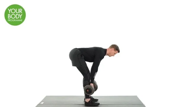 Stand, feet hip width apart and dumbbells held in both hands. Place your weight into your heels, hinge forward from the hip with slight knee flexion and lower the weights towards the floor. Only go to the point where you can maintain neutral spine, do not round the lower back. Engage the glutes and straighten the legs as you stand upright.