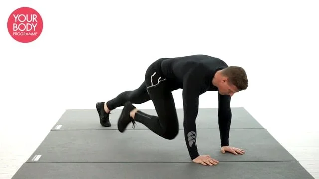 Place your weight onto your hands and toes. Extend the body in a straight line with the shoulders placed over the wrists. Alternately draw a knee towards your chest, springing from 1 foot to the other. Keep the movement continuous and core engaged.