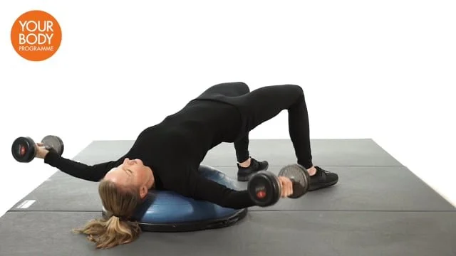 Support your head and shoulders on a bosu, raise your hips and squeeze your glutes. Hold the dumbbells above you with slight elbow flexion. Inhale as you open the arms out to the side until they are in line with the shoulders. Exhale as you raise the dumbbells. Use your core to stabilise the body.