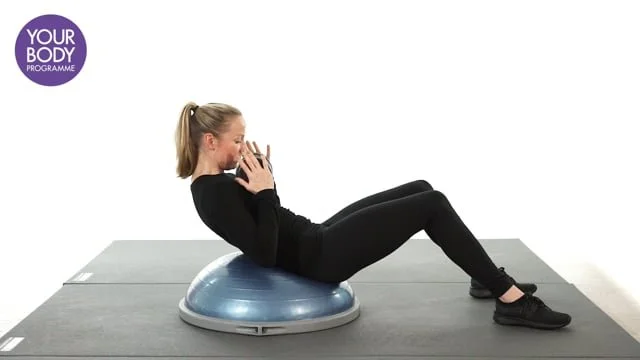 Lie with your back extended over a bosu and hold a dumbbell to your chest. Curl up into a crunch, keeping a slight gap under the chin and simultaneously tilt the pelvis under. Lower under control.