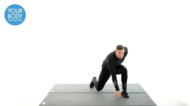 Begin in a press-up position, hands just wider than shoulder width and feet together. Perform a press-up then take 2 step laterally, using the opposite hand to leg. Repeat the press-up and reverse the lateral move.PRESS-UP