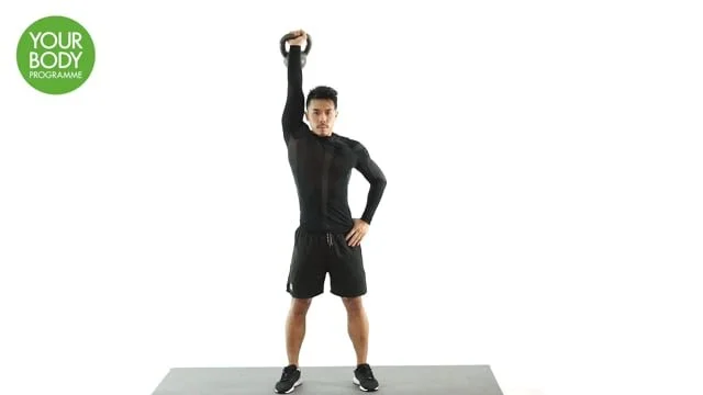 Take a shoulder width stance and hold a kettlebell in 1 hand with the arm extended to the floor in front of you. Bend the knees and hinge from the hips with a neutral spine. Lift the bell by extending the legs and as the bell passes the knees extend at the ankles, knees, and hips forcefully, similar to a jumping motion. Use the momentum to lift the bell as high as possible in a straight line close to the body with the elbow out. At the height of this movement your feet should clear the floor. Bring the bell to the shoulder and press overhead. Lower under control.