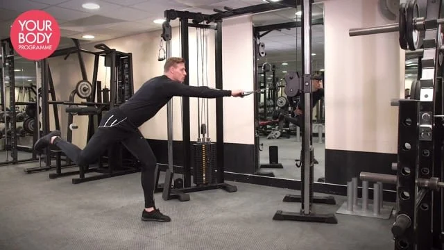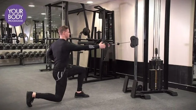 Stand in a lunge position and hold a cable (at chest height) in the opposite hand to front leg. With the torso upright perform a lunge with the arm extended then pull into a single arm row as you straighten the legs.