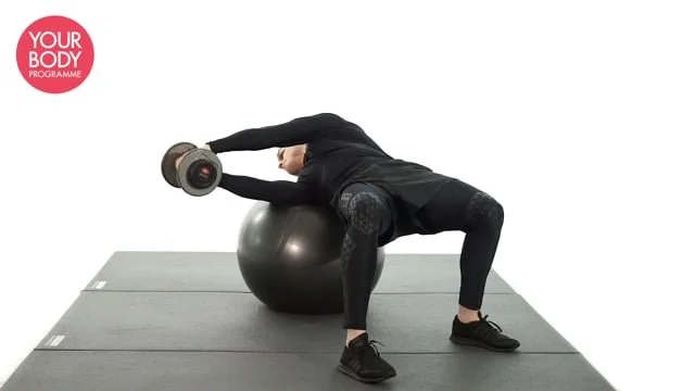 Begin with your head and shoulders on a swiss ball and hold a dumbbell overhead in both hands. Keep the arms extended as you lower the dumbbell to one side allowing the body to rotate with it. Draw it back to centre and repeat to the other side.