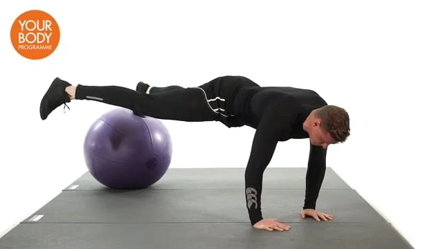 Lie on your back with 1 foot on a swiss ball (leg extended) and the other raised above you. Lift your hips and place your arms by your side for support. Bend the knee as you roll the ball towards you. Lower the hips to the floor, immediately raise the hips then extend the leg.