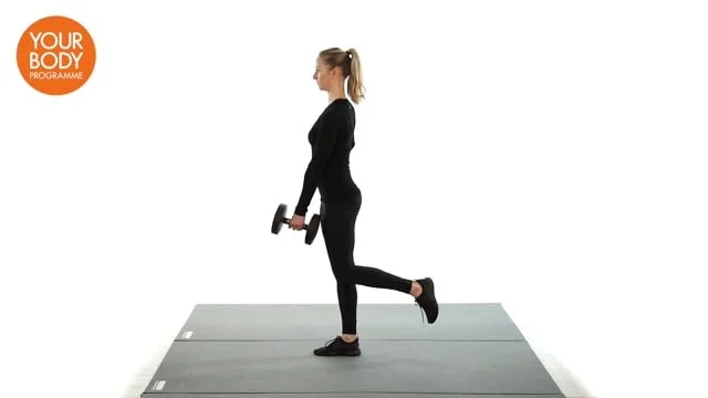 Stand on 1 leg and hold a dumbbell in the opposite hand. Bent the supporting knee, hinge forward from the hip and lower the dumbbell towards the floor. Allow the free leg to move backwards. Only go to the point where you can maintain neutral spine, do not round the lower back. Straighten the leg as you stand upright.