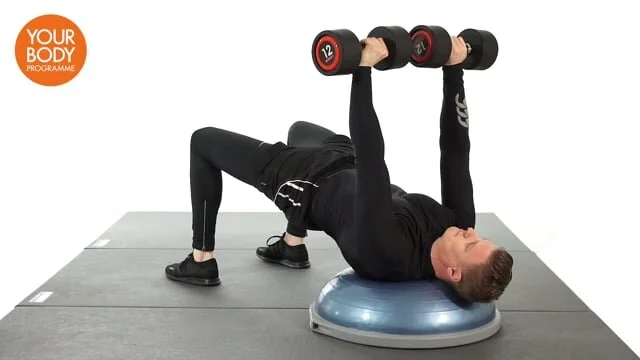 Support your head and shoulders on a bosu and raise your hips with the glutes contracted. Hold dumbbells above you with the arms extended. Lower the dumbbells bringing the hands towards the shoulders with the elbows flared out to the side and simultaneously lower the hips. Extend the arms and raise the hips.