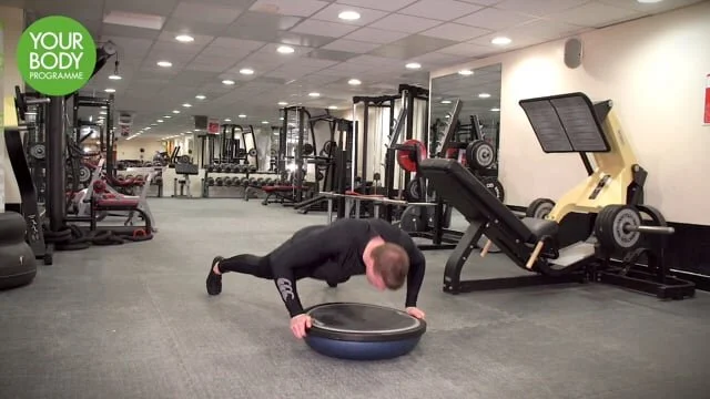 Begin holding a bosu at chest height in both hands. Bend the knees and place it on the floor in front of you (flat side up). Bounce it forward twice so the body is extended and perform a press-up holding the bosu. Jump the feet forward to squat position and place the bosu on the floor to continue.