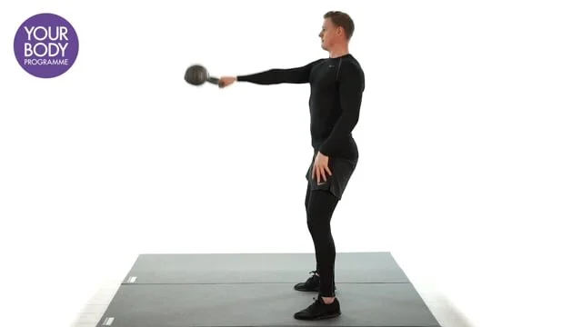Stand feet slightly wider than shoulder width and hold a kettlebell in both hands. Squat and swing the bell through the legs maintaining neutral spine, do not round the lower back. Allow the momentum to lift the bell up to shoulder height, do not lift with the arms. Keep the core engaged.