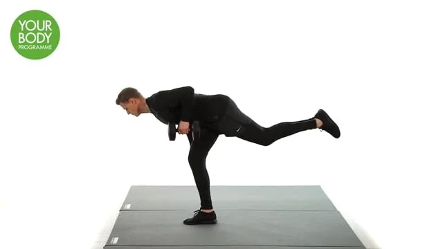 Begin feet hip width apart. Take your weight onto 1 leg and hold a dumbbell in the opposite hand. Hinge at the hip and bring your torso parallel to the floor with slight knee flexion. Pull with the arm to perform a single arm row, elbow close to your body. Stand upright to join the legs.