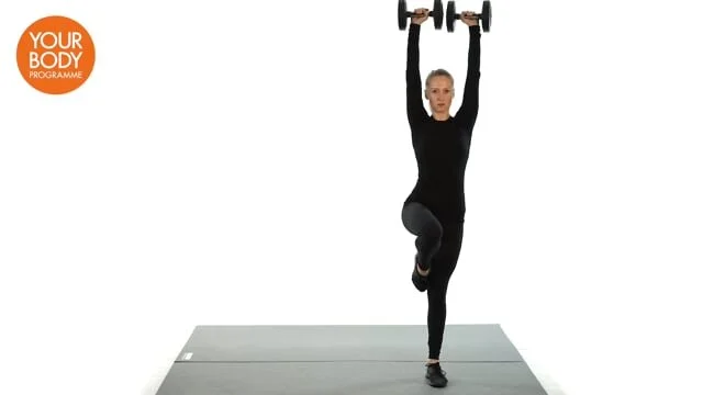 Stand on 1 leg, hold dumbbells above you, arms extended. Bring the dumbbells to your shoulders as you step laterally into a side lunge. Heels down, push the bottom back and allow the torso to hinge forwards slightly from the hips. Push back to a single leg balance, extend arms.