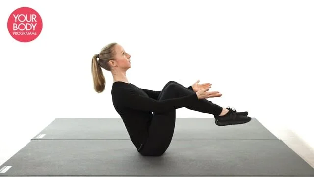 Sit upright, maintain neutral spine and raise the legs with the knees bent. Lean the body backwards slightly and lift the chest. With the arms extended in front of you, lower the torso to the floor and extend the legs until they are in inch off the floor. Return to the starting position, shoulder back, chest lifted.