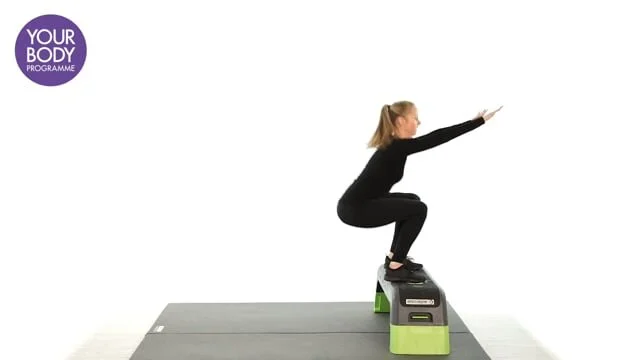 Stand with your feet hip width apart. Jump onto the box landing in a squat position. As you jump off, place your hands onto the floor and jump your legs back into a plank position. Jump back to a squat to begin again. Keep the movement fluid and aim to maintain neutral spine throughout.